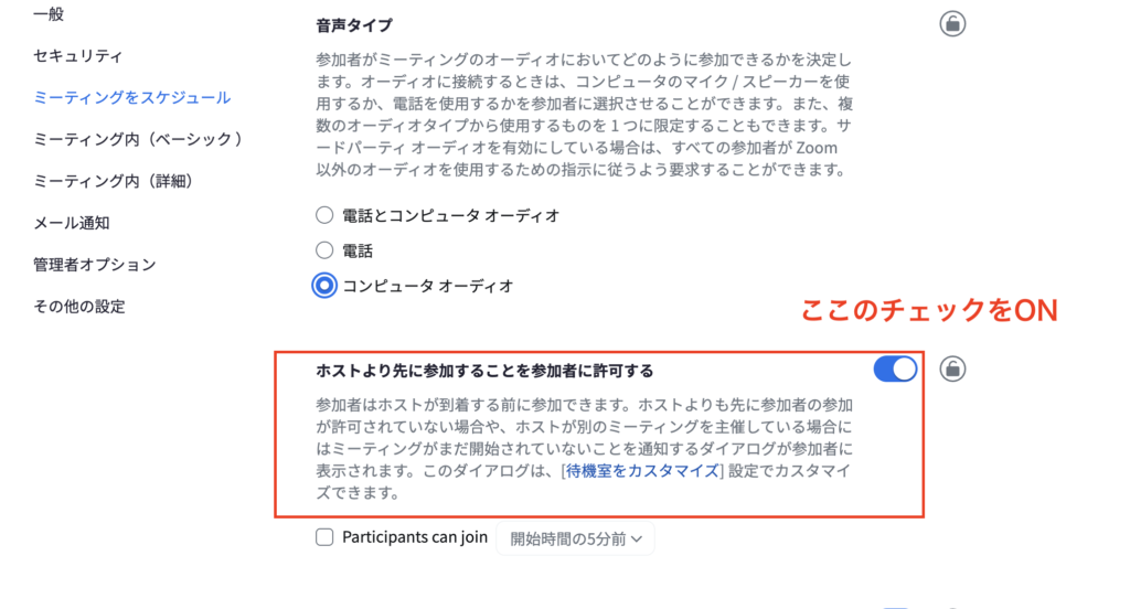 - 「ホストより先に参加することを参加者に許可する」オプションをオンにします。